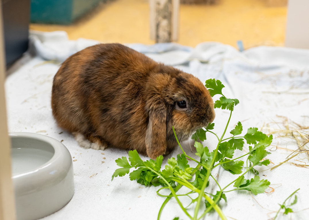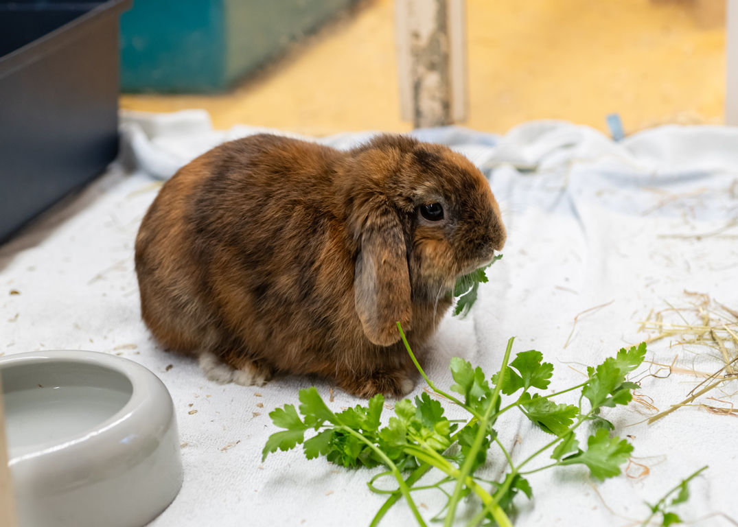 Krampus ist ein Widderkaninchen und damit leider eine Qualzucht. Seine Ohren und Backenzähne müssen regelmäßig kontrolliert oder gespült werden.